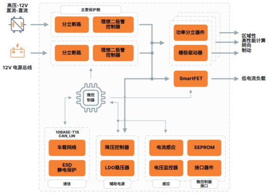 电源分配单元 (PDU) 是车辆区域控制架构中的关键组件, 在配电层次结构中承担初始配电的作用。PDU 连接到车辆的低压(LV) 电池(通常为 12V 或 48V) 或者 HV-LV DC-DC 转换器的输出端, 由转换器将高压 (HV) 电池的电压降低。